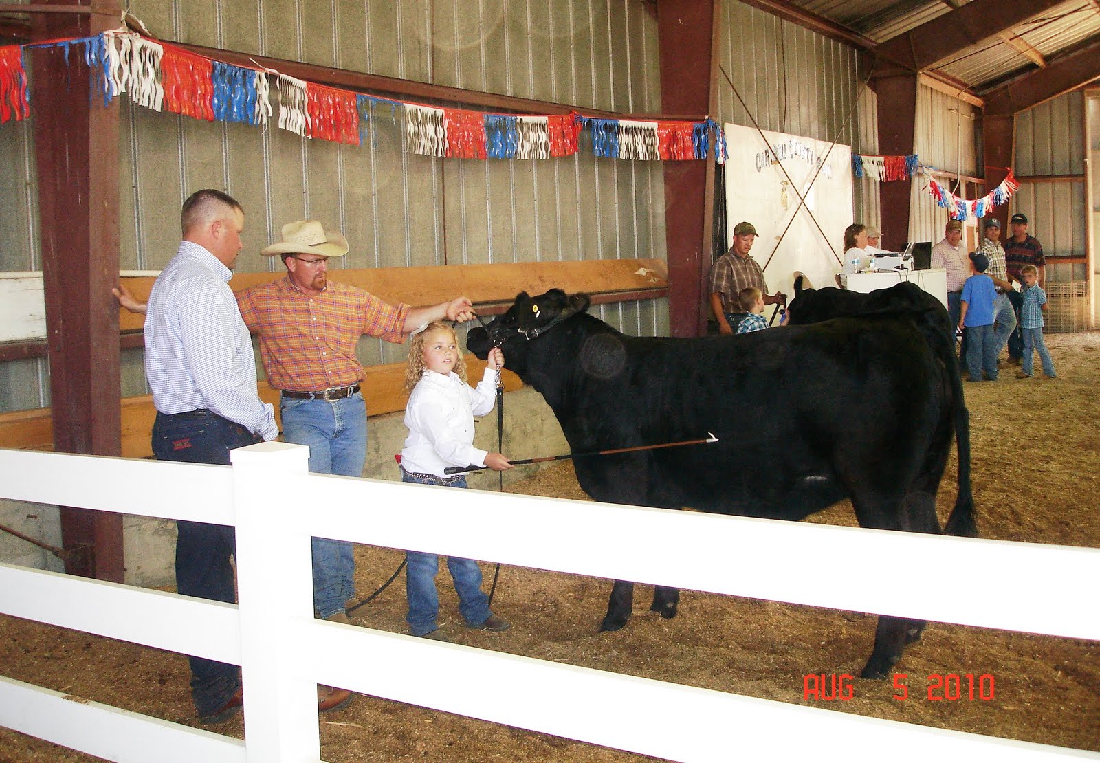Look at that scowl! This year Jeslyn participated in the County Fair. She had several different projects, her favorite one was the Beef Breeding Project where she showed her heifer Lindy. She spent many days getting ready. She also had to feed her night and morning. For the project she had to keep a record book, she also had to write a story about her experience. This is her story…